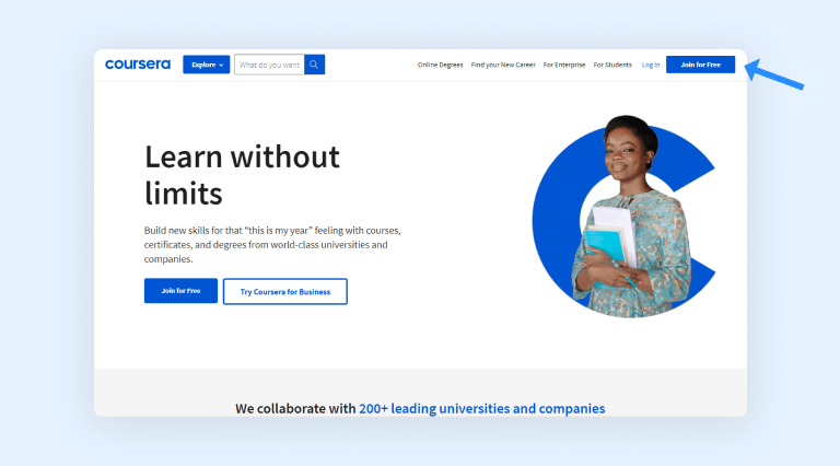 To create a Coursera account, all you need to do is to click the "Sign up" button on the Coursera homepage.